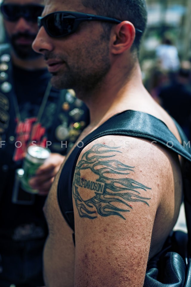 Biker with tatoo of Harley-Davidson in h…