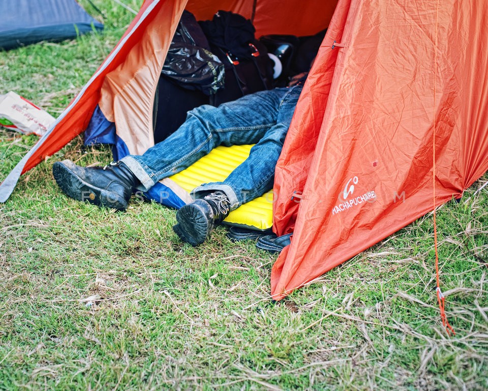 Biker sleeping in his tent, in internati…