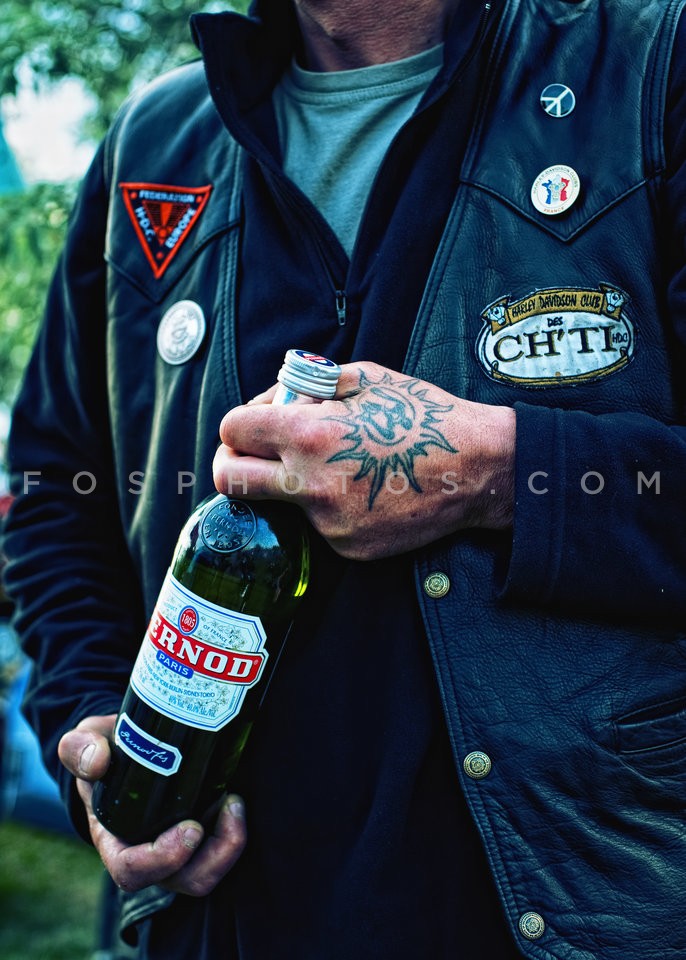 Biker holding a bottle of Pernod liqueur…