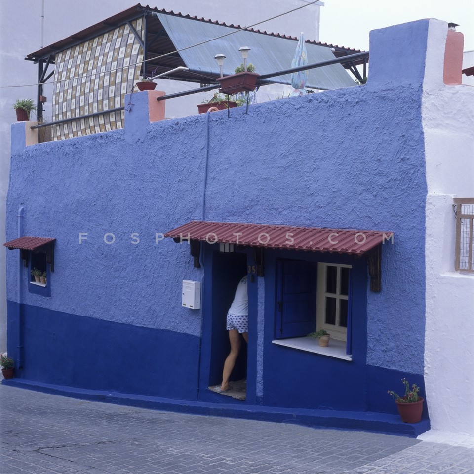 Woman entering blue house in Megara, Gre…