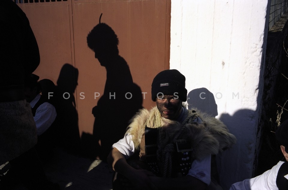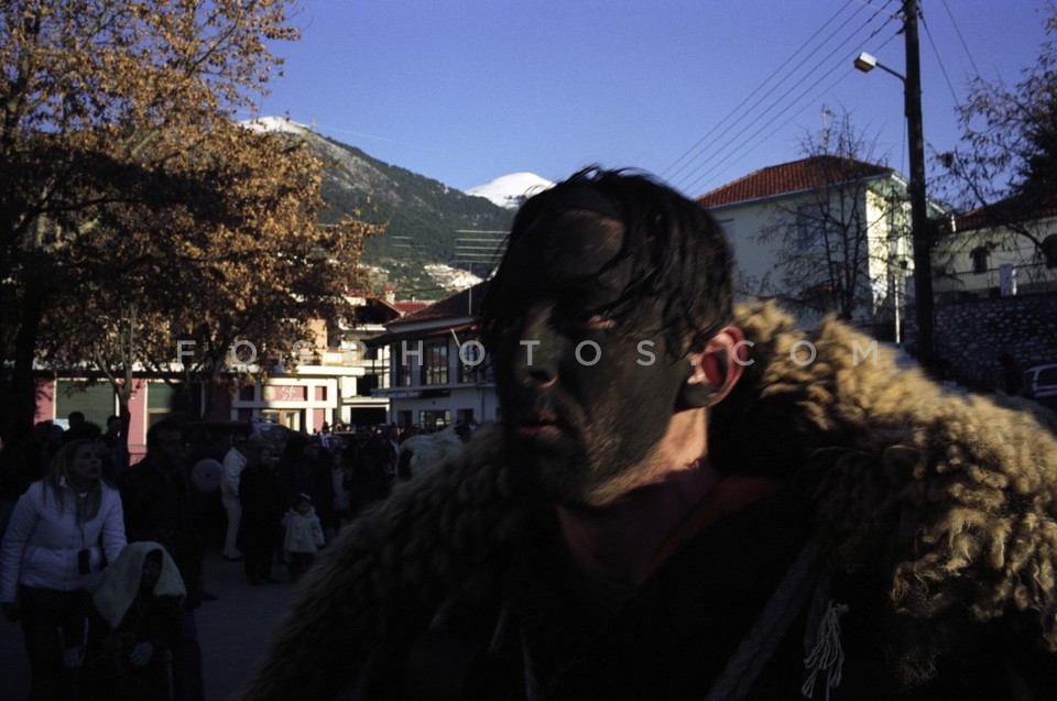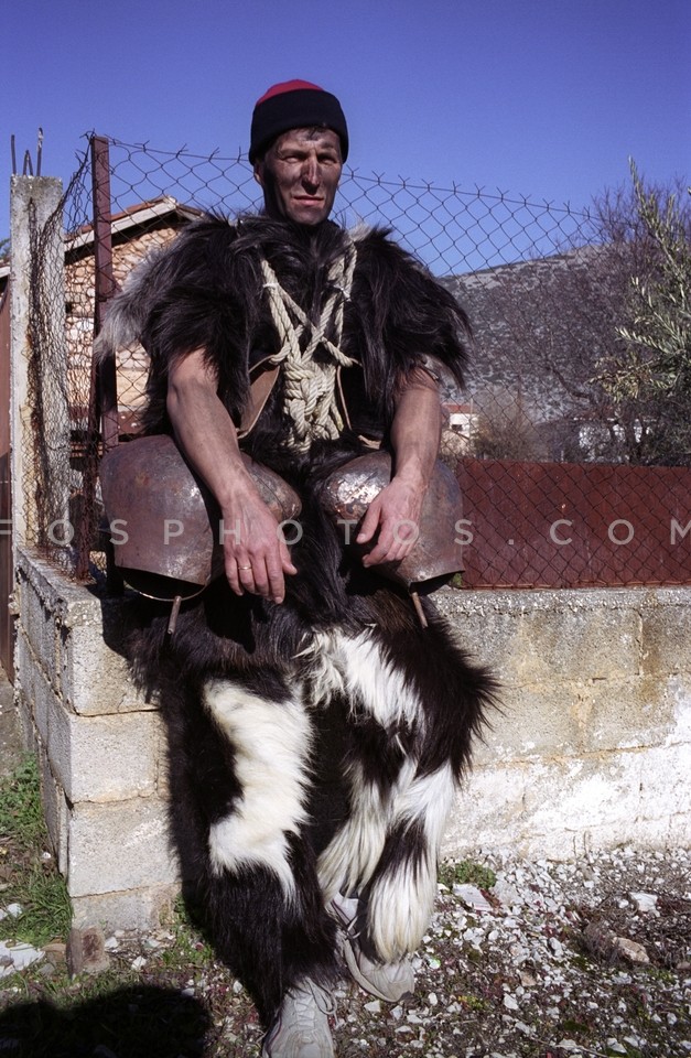 Man wearing sheepskins and bells partici…