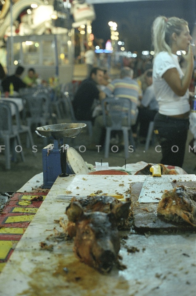 Pigs head on a food bench at the fair of…