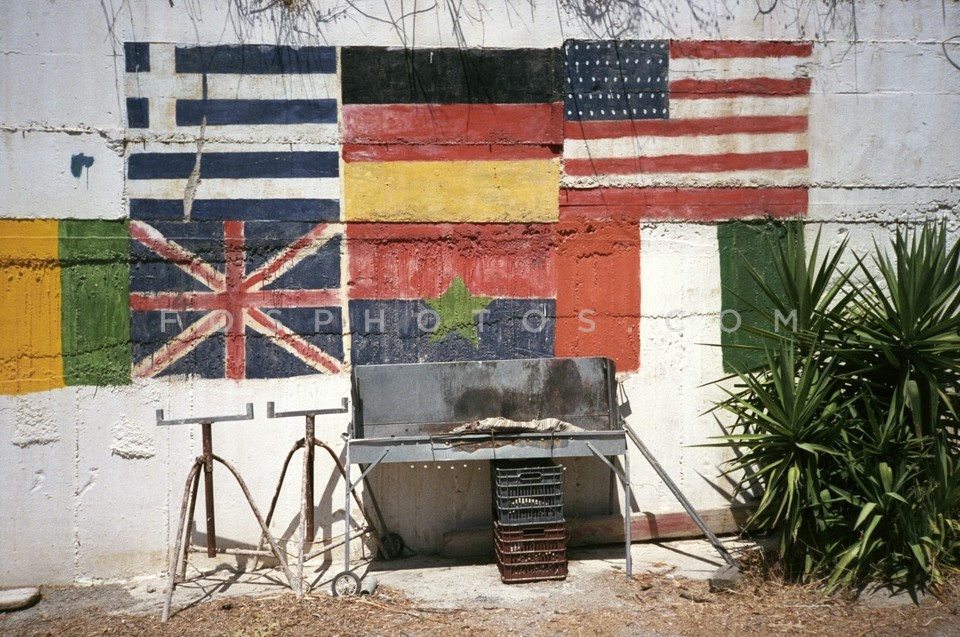 Grill in front of a flag painted wall in…