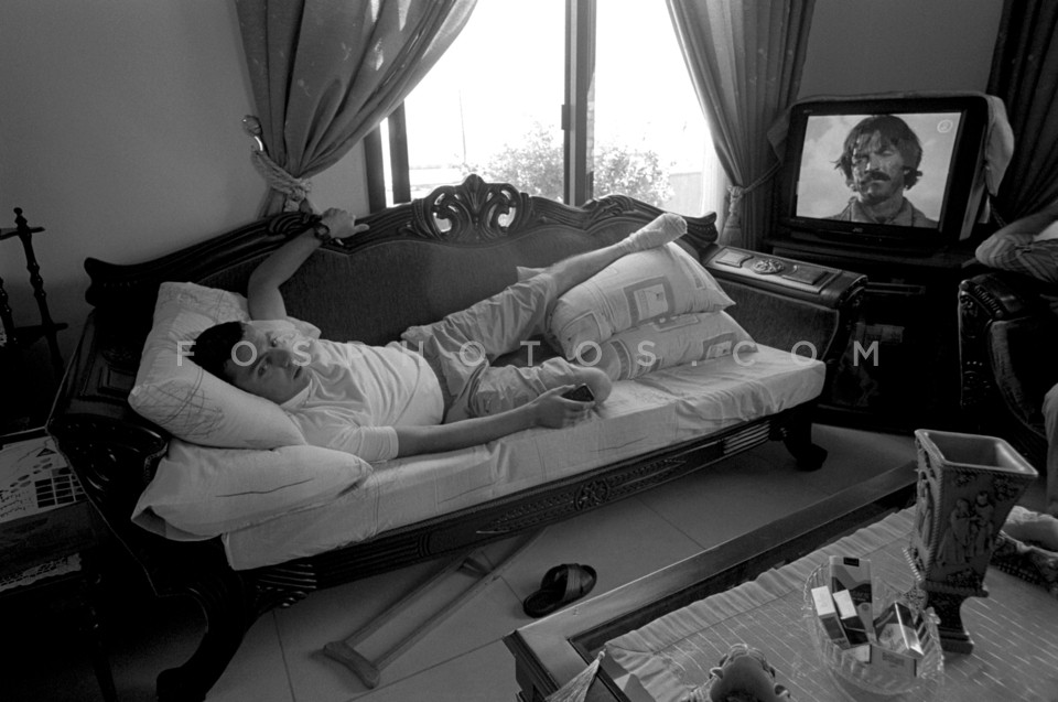 Injured man relaxing on the couch of his…
