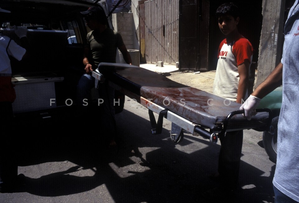 Men carrying a blood-stained stretcher i…