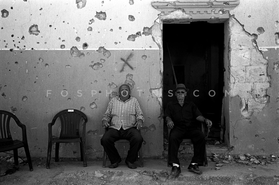 Elderly men in front of damaged house in…