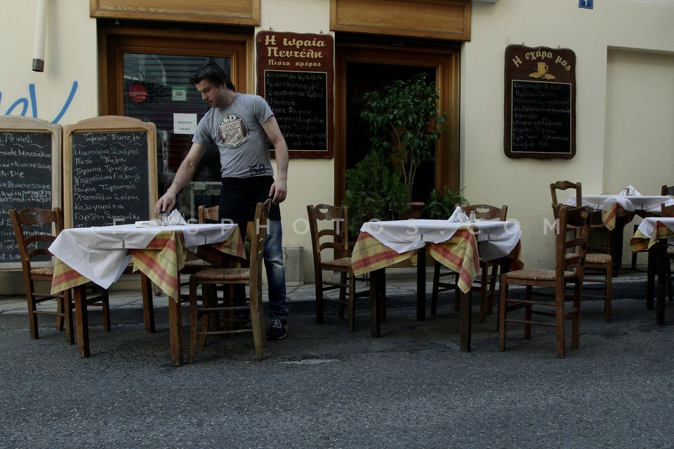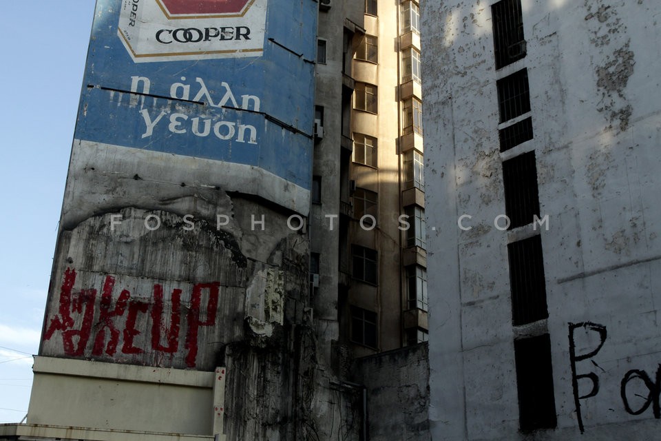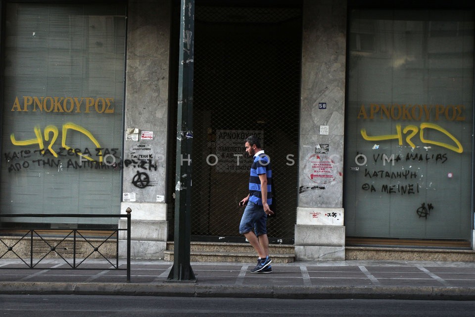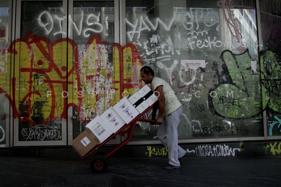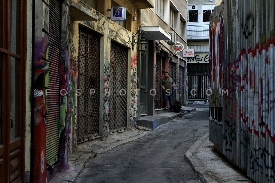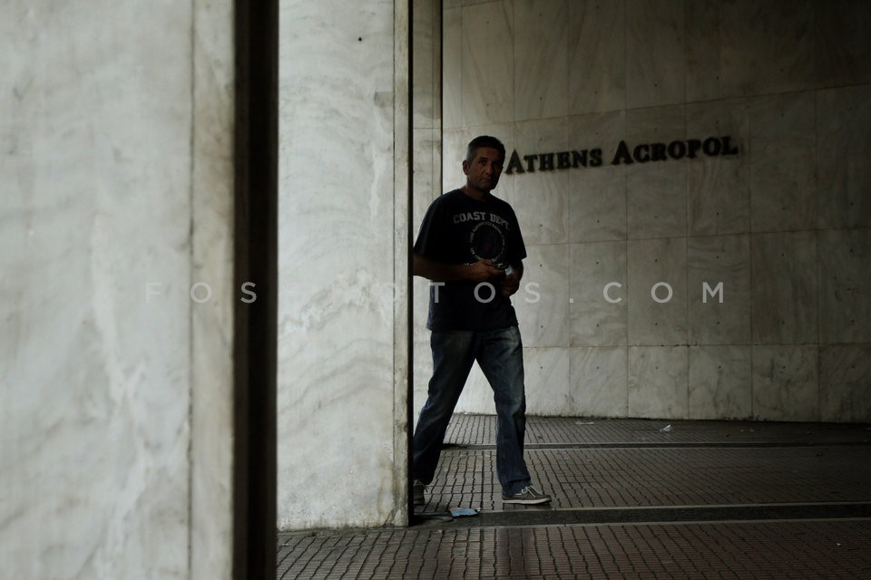 Man outside a closed hotel in Omonia Squ…
