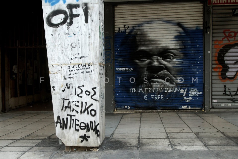 Graffiti image of Socrates in closed sho…