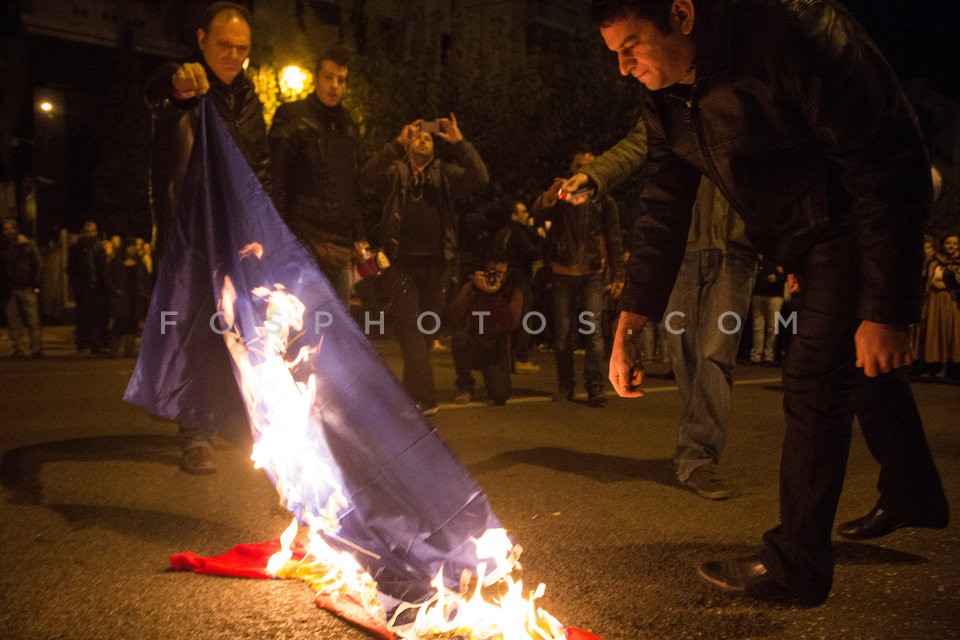 Students burn a NATO flag in front of th…