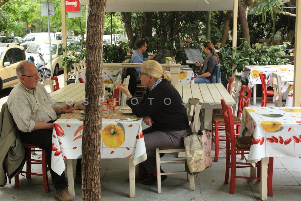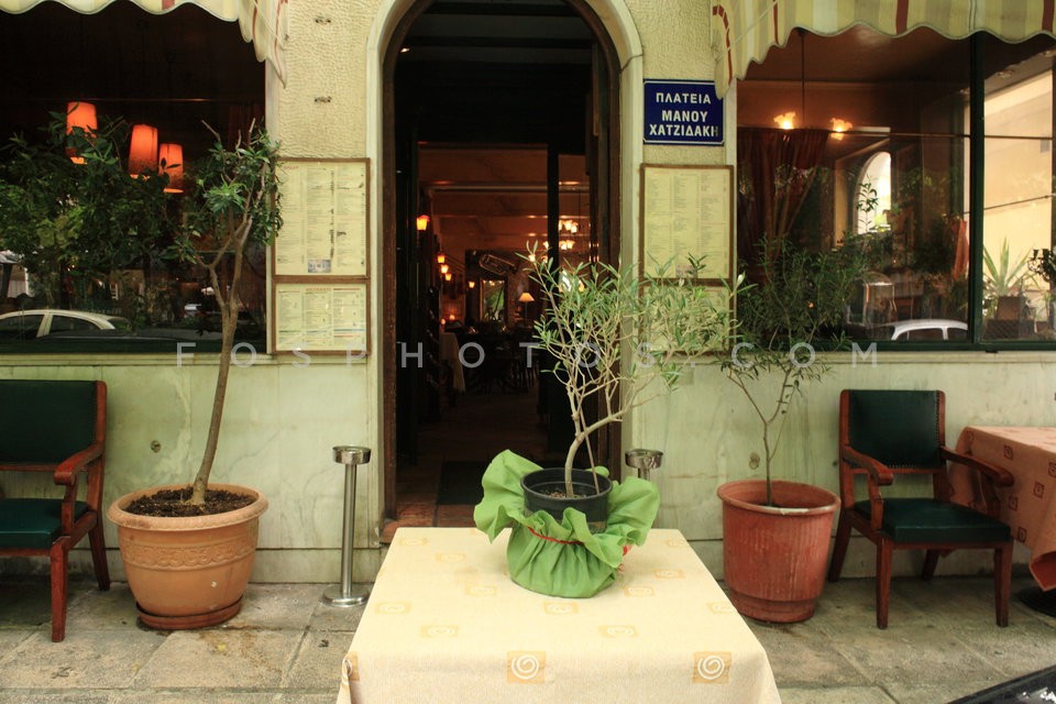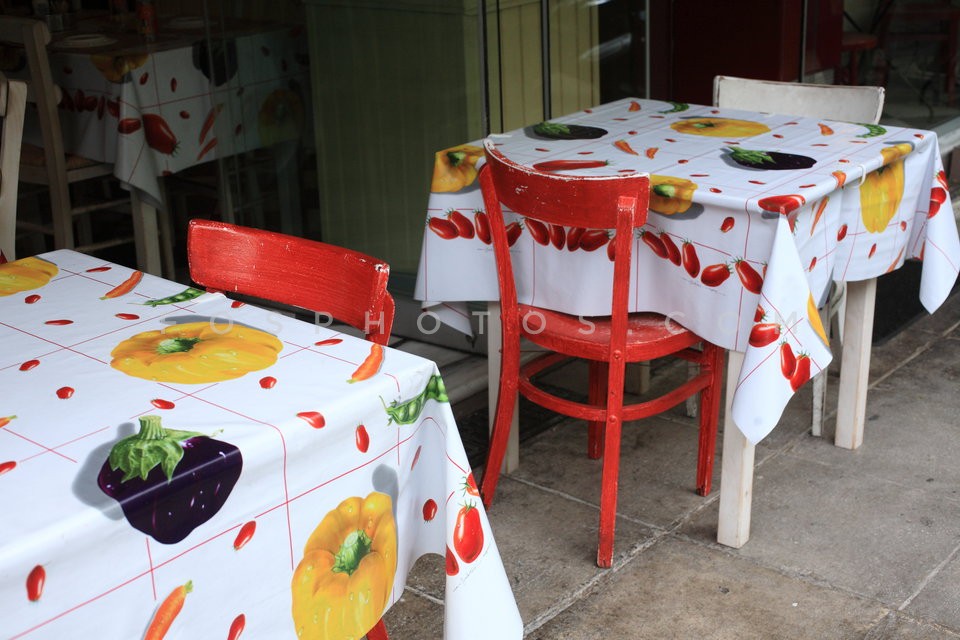 Restaurant tables at Proskopon square in…