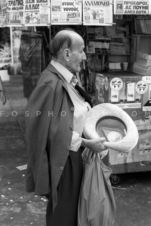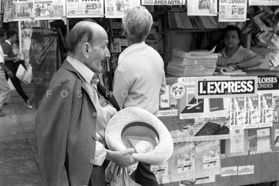 Old man in front of kiosk, September 1990