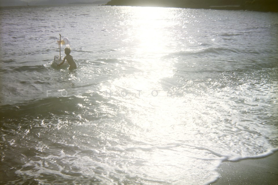 Boy with a toy boat diving in the sea, A…