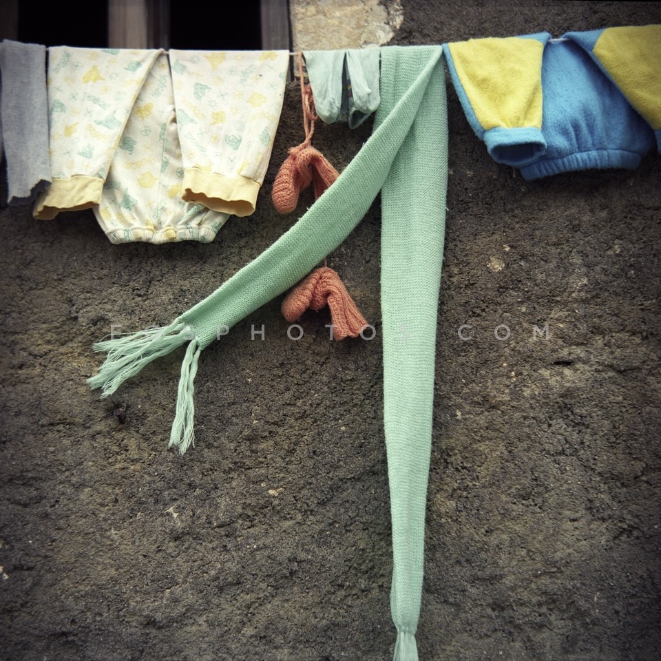 Clothes hanging on a rope on the outside…