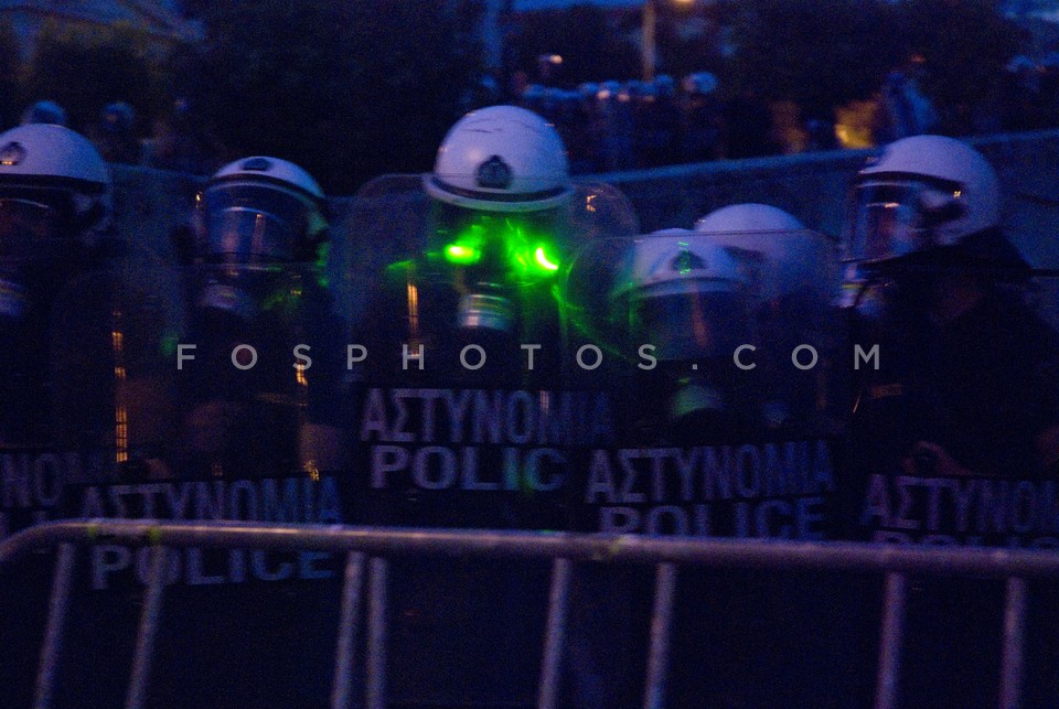 Riot policeman lit by laser beam during …