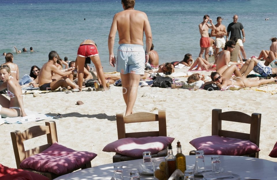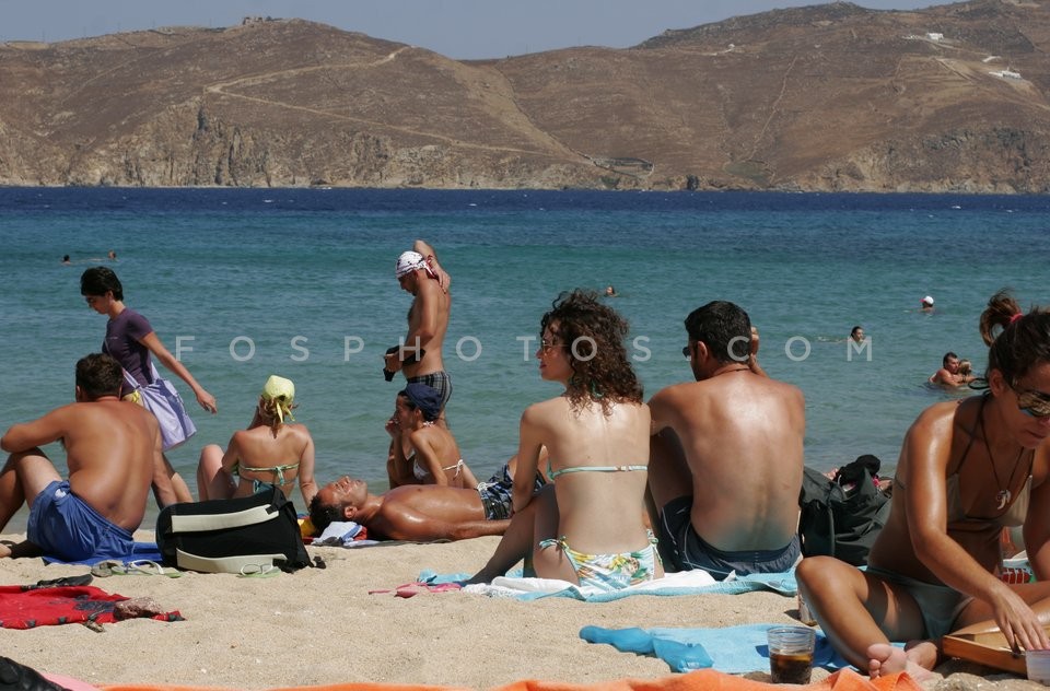 Crowded beach in Mykonos Island, Cyclade…