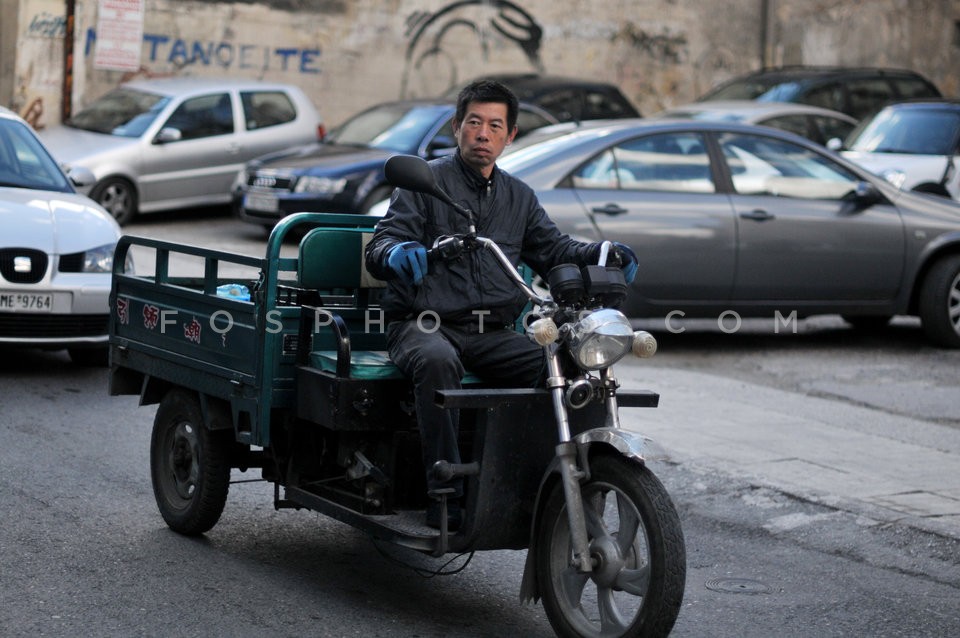 Chinese man in cargo tricycle, downtown …