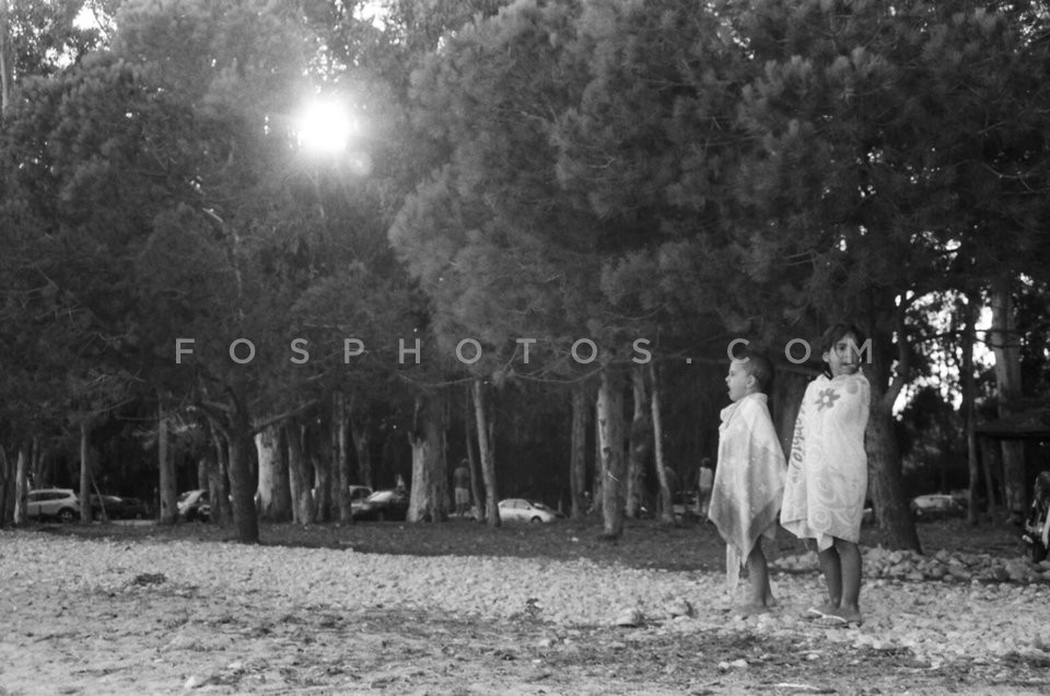 Children wrapped in towels on the beach,…