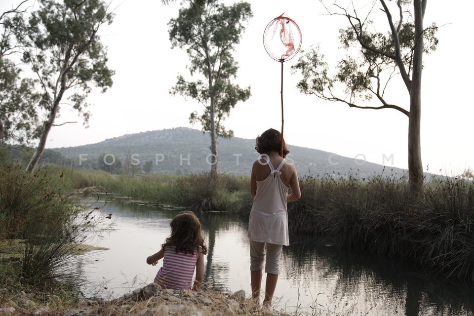 Two little girls playing on the shore of…