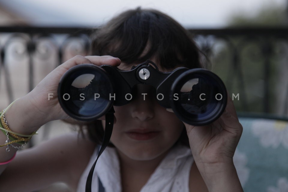 Little girl looks through binoculars, Gr…