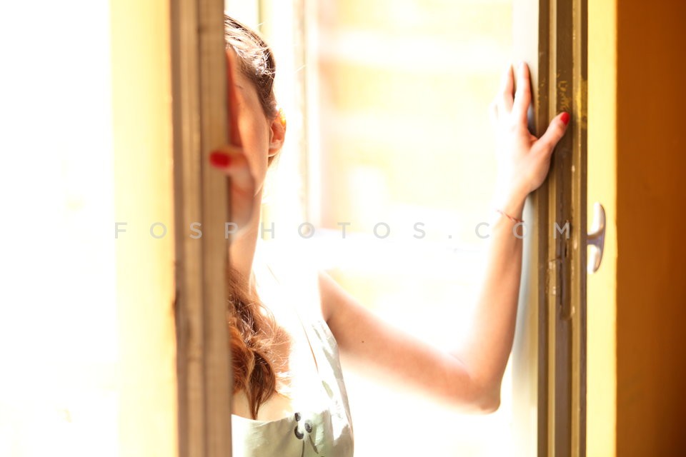 Woman standing at a door, Athens, Greece…