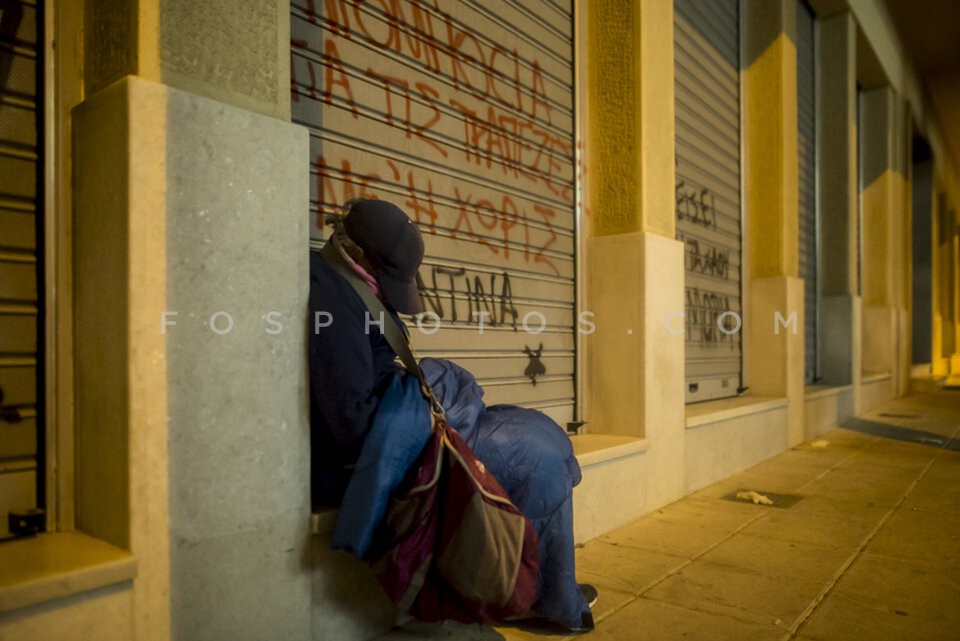 A man sleeps on a sidewalk, Athens, Gree…