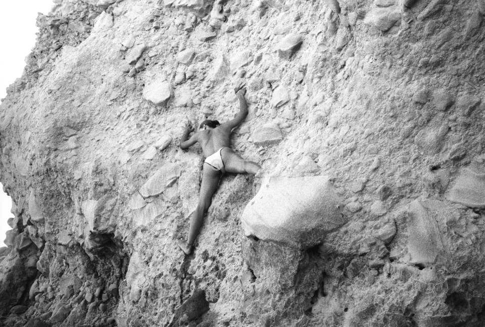 Girl climbing on rocks by the sea, Milos…