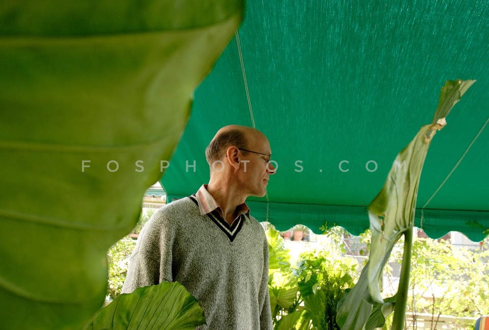 Man in a balcony with plants, Athens, Greece