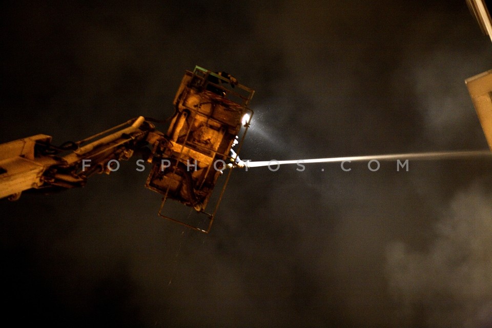 Fireman hosing during a night of riots t…