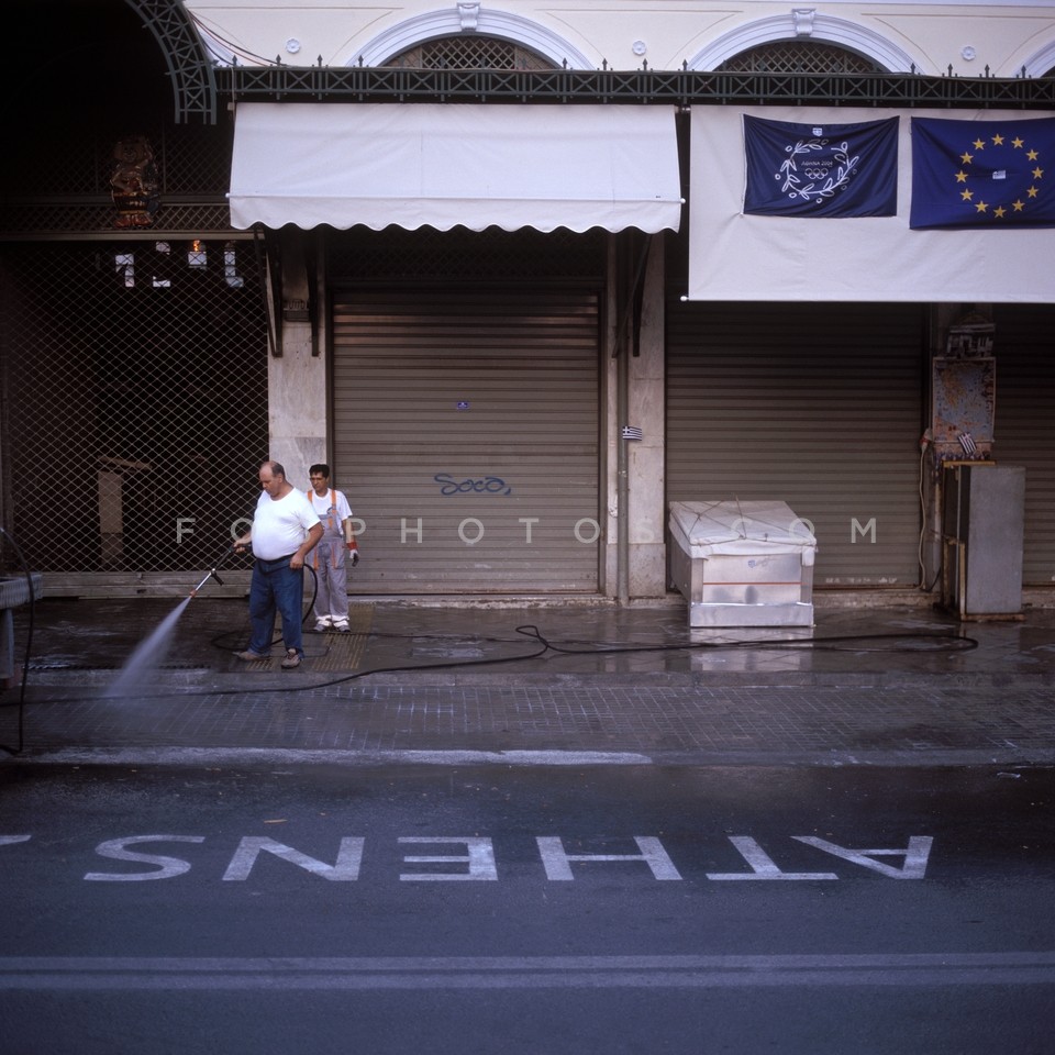 Cleaning the entrance of Varvakeios Mark…