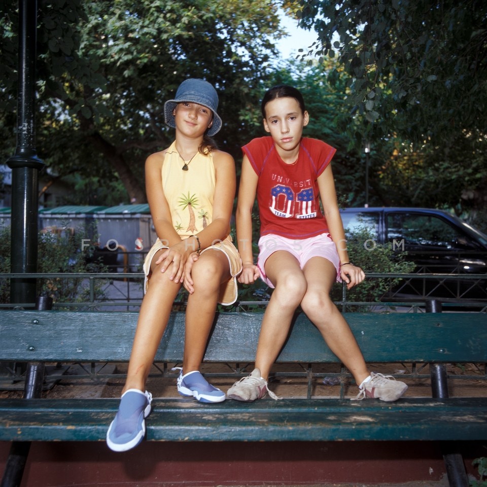 Young girls on a bench in Fokionos Negri…