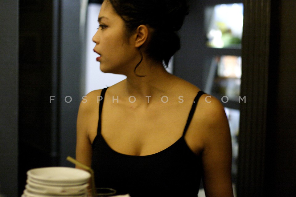 Waitress carrying plates in bar Higgs in…