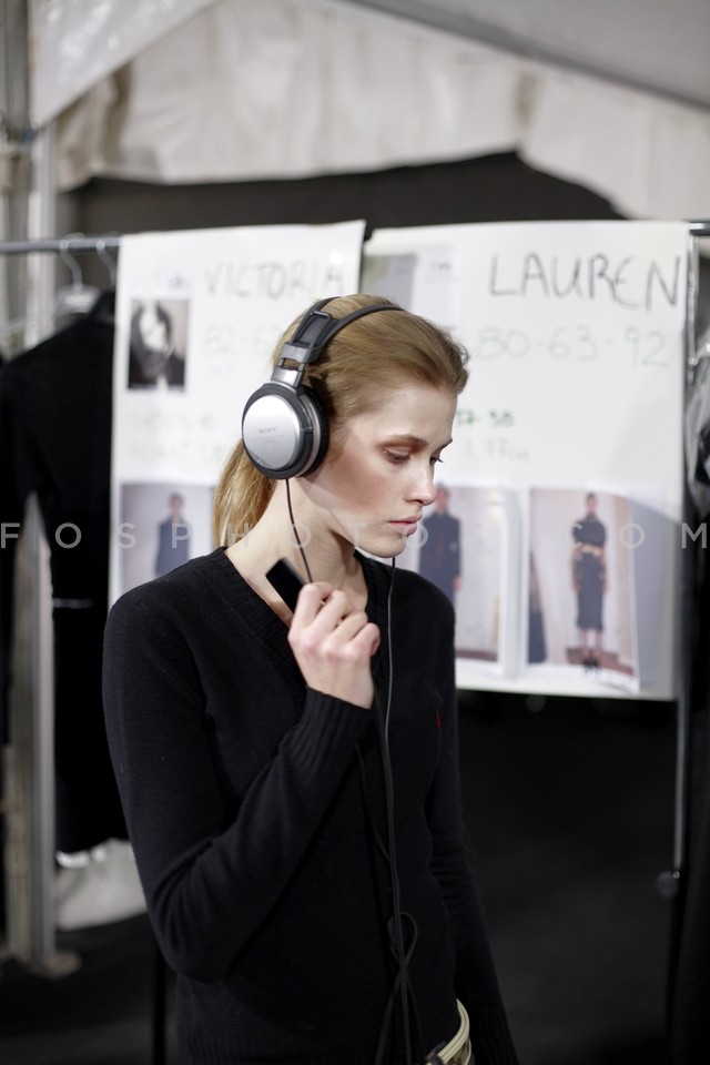 Model wearing headphones backstage at th…