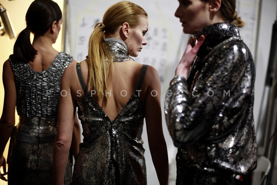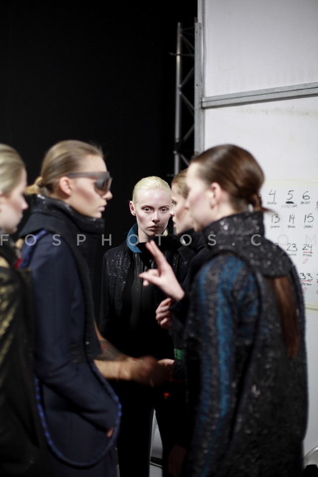 Models discussing backstage at the Deux …