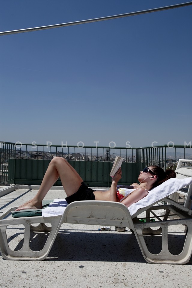 Young model sunbathing at the roof terra…