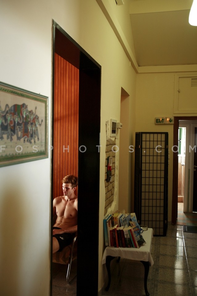 Young male model sitting in his hotel ro…