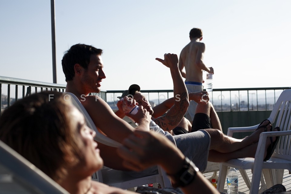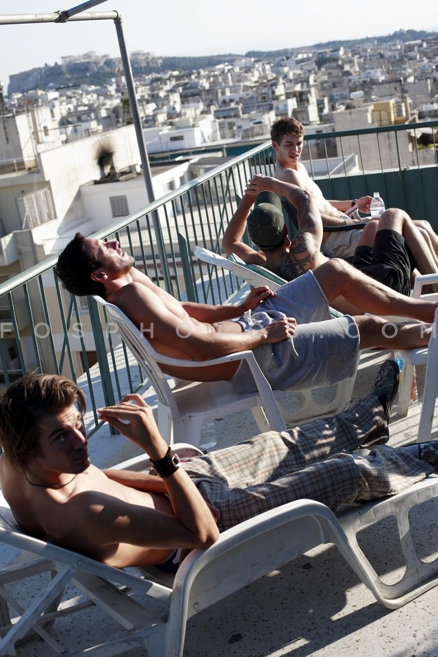Male models sunbathing at the roof terra…