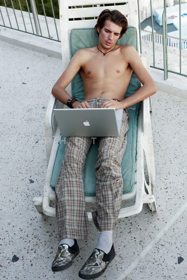 Young male model with laptop at hotel ro…