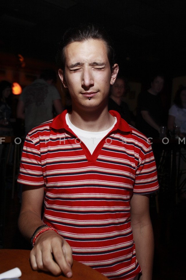 Young man in rock bar with eyes shut, At…
