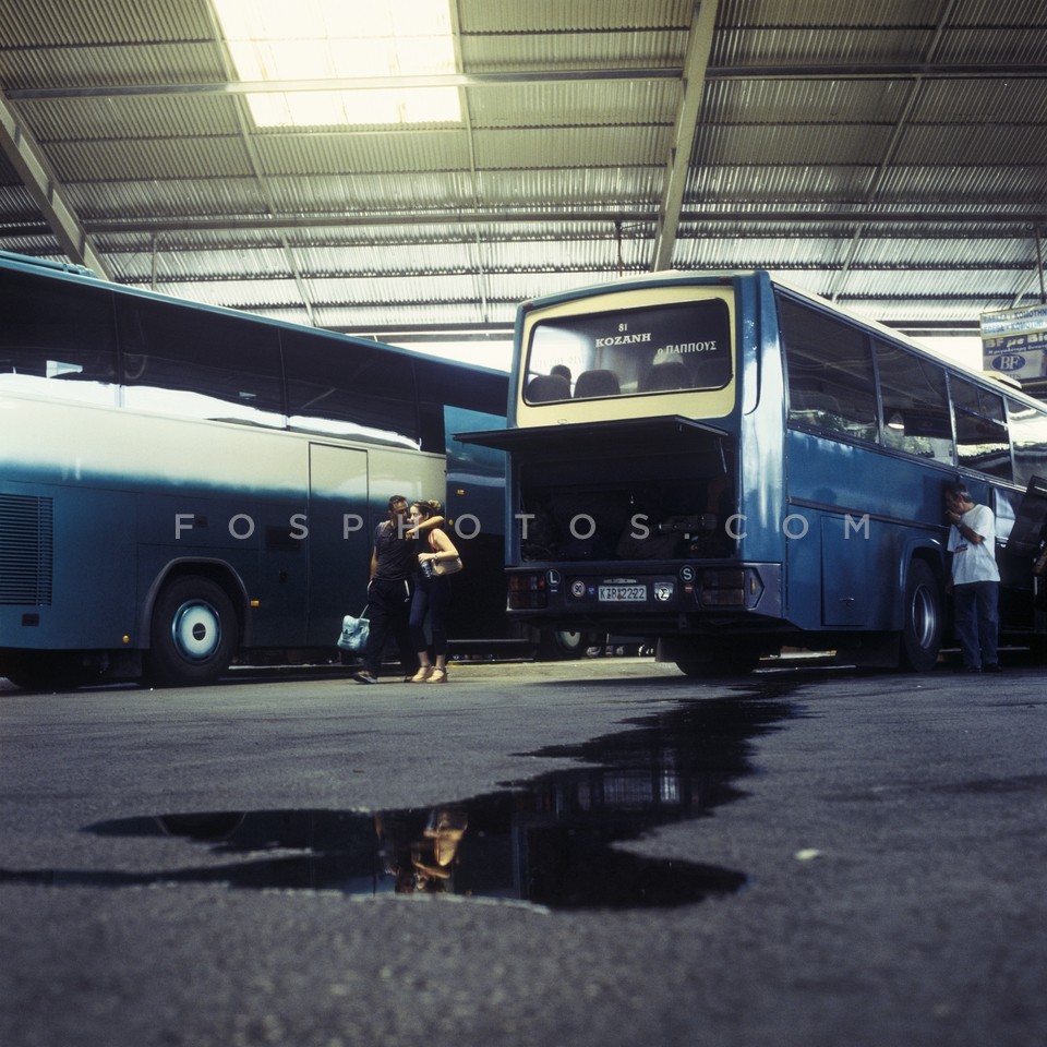 Embracing couple at the central bus stat…