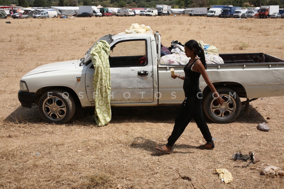 Young Roma woman in front of pick up, at…