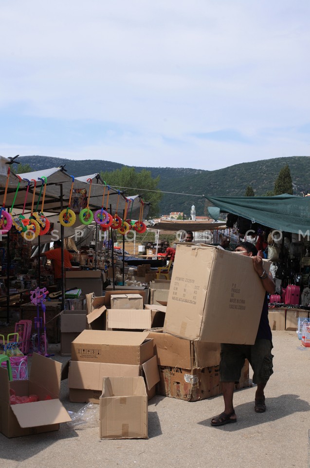 Man carrying carton box at the bazaar ne…