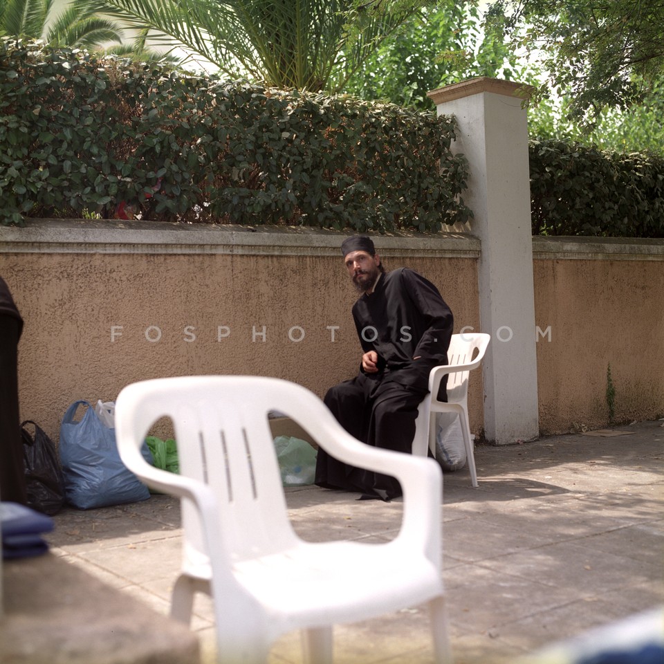 Slav monk sitting outside the monastery …