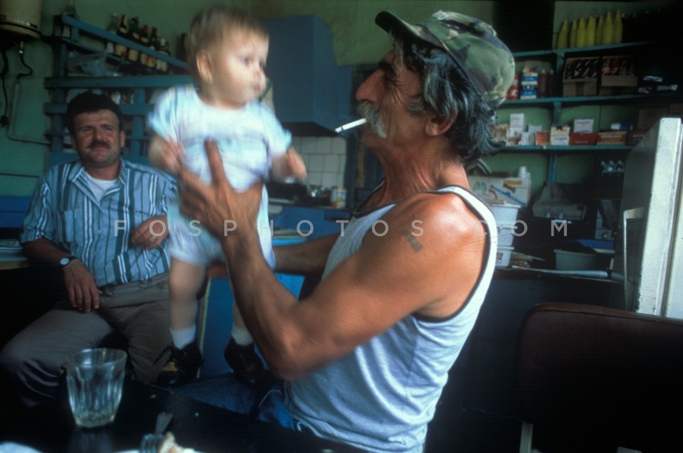 Pomak man with baby at the village cafe,…