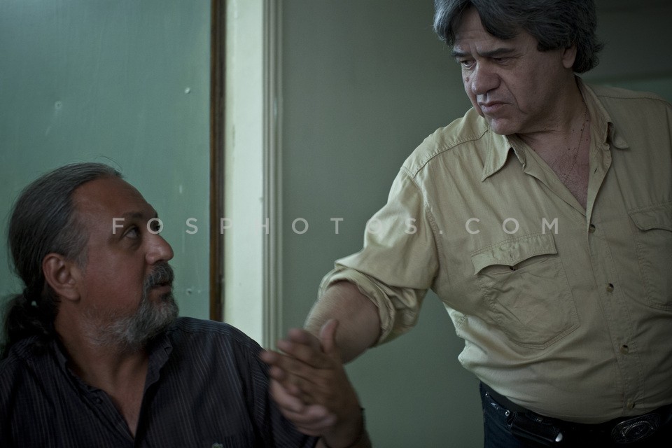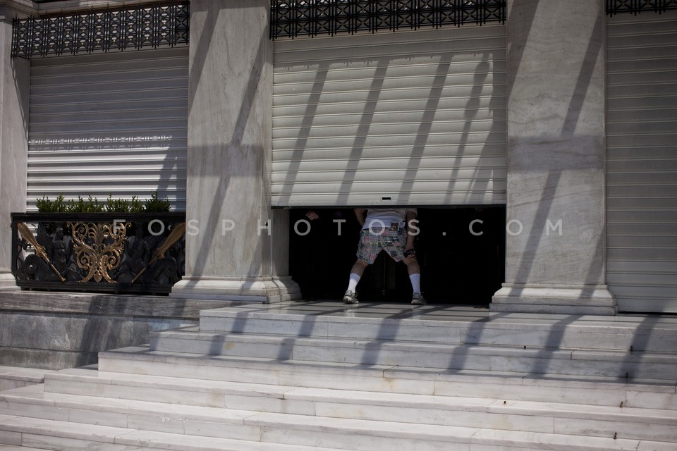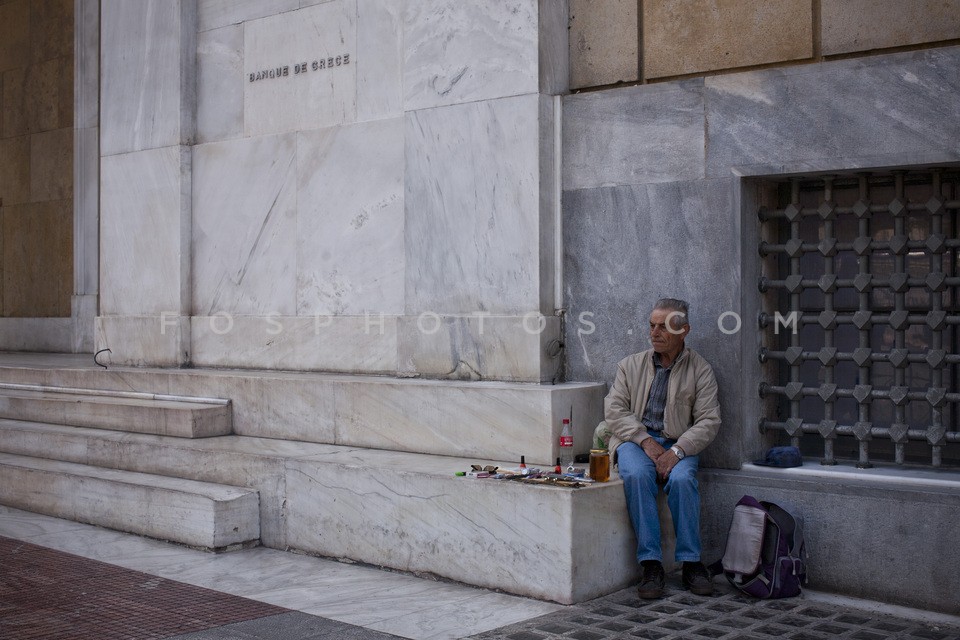 A poor man outside the Bank of Greece, M…