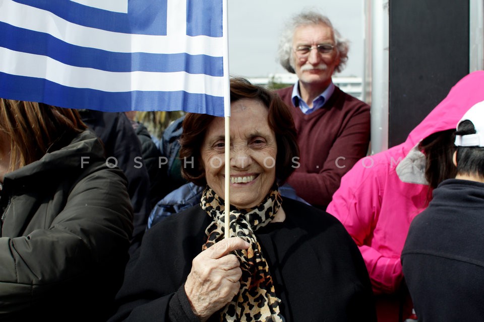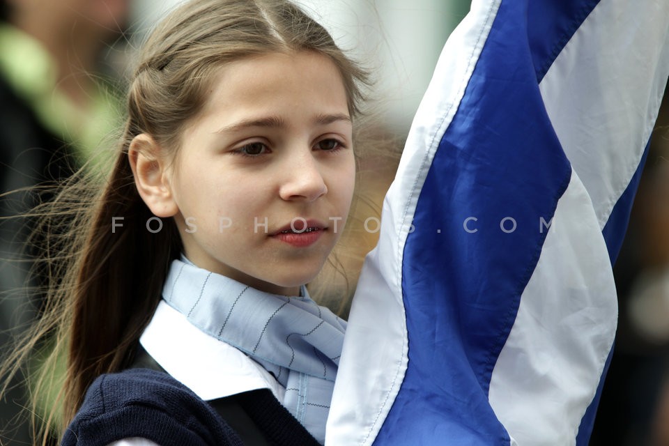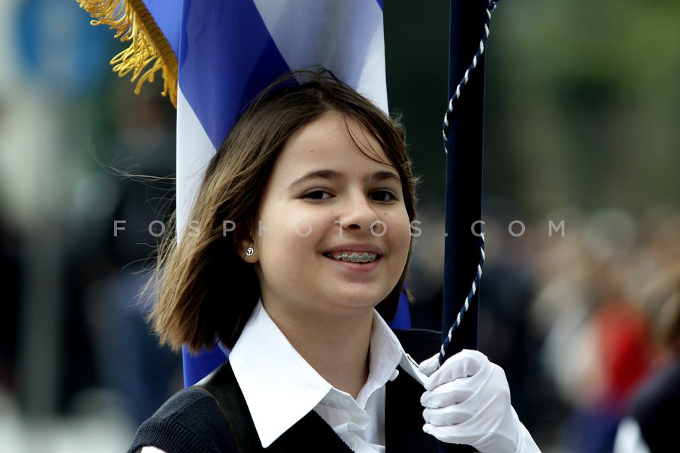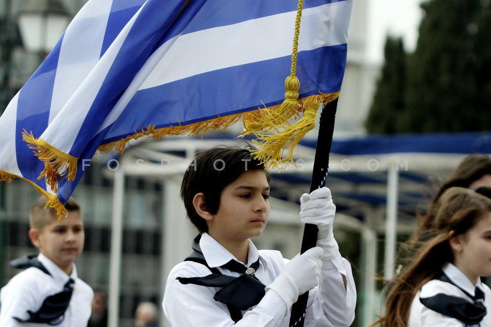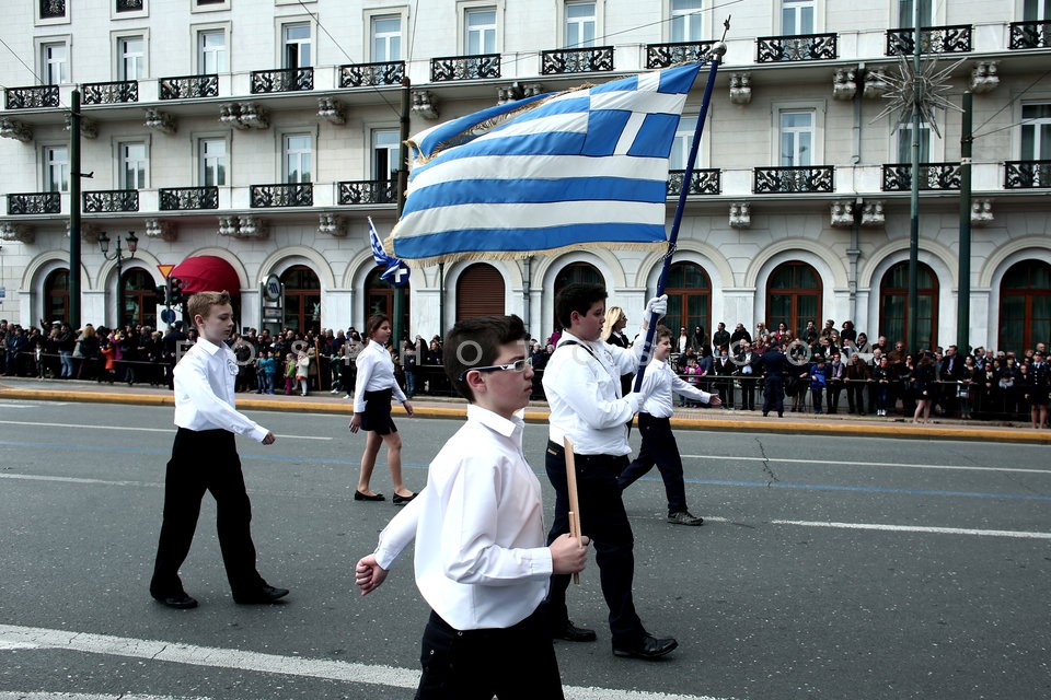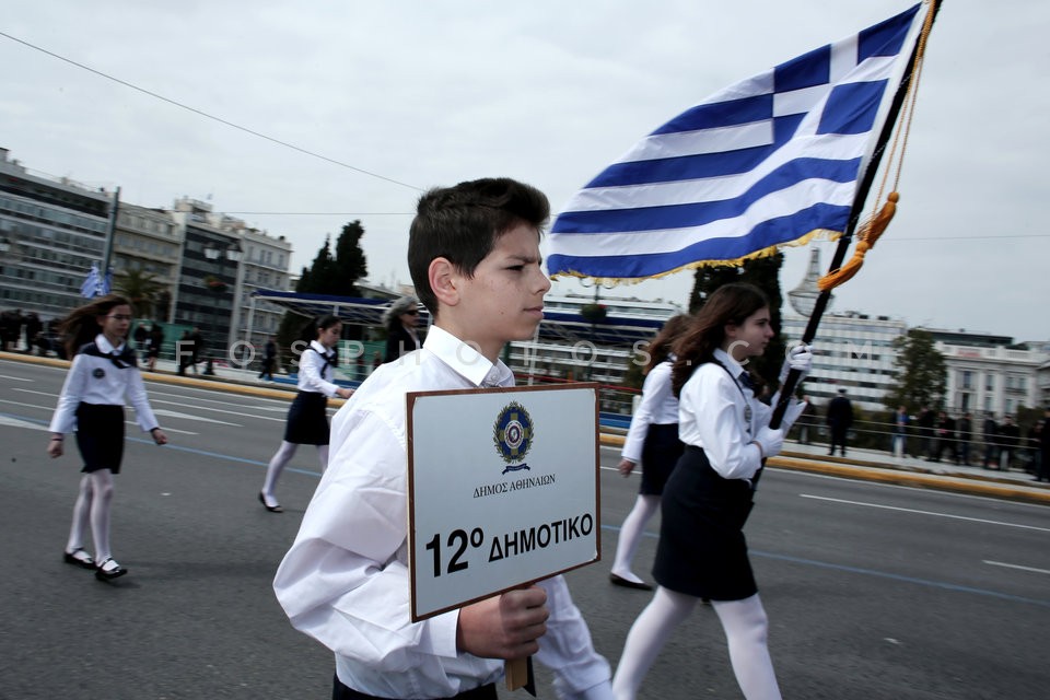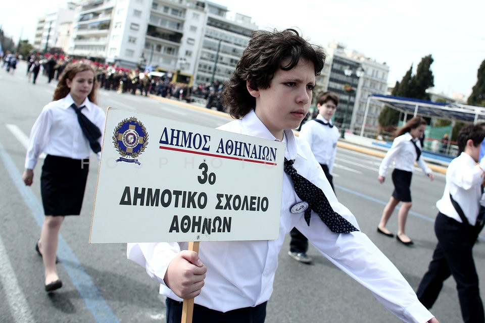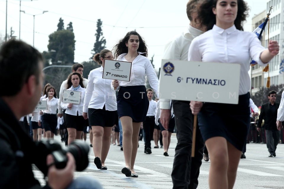 School students march during a parade to…