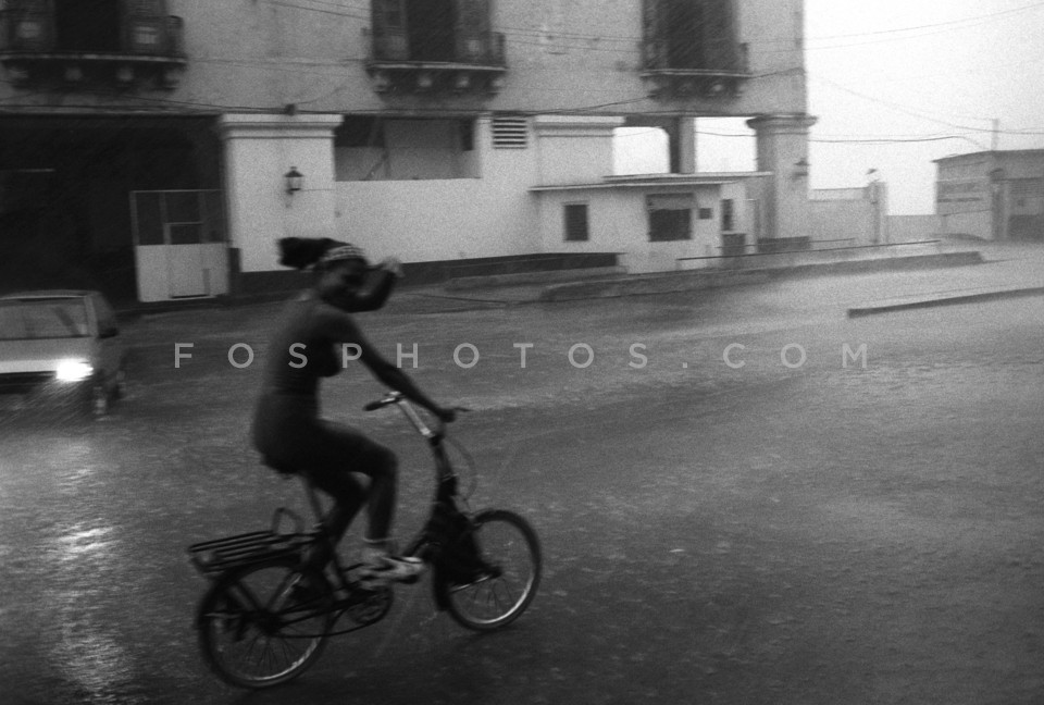Woman riding bicycle in the rain, Havana…