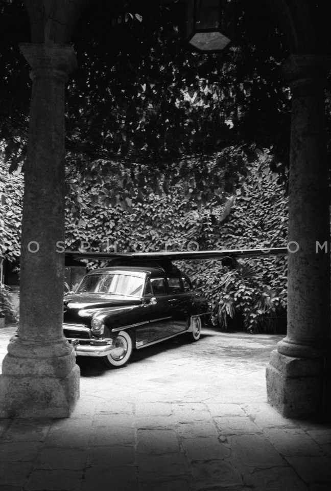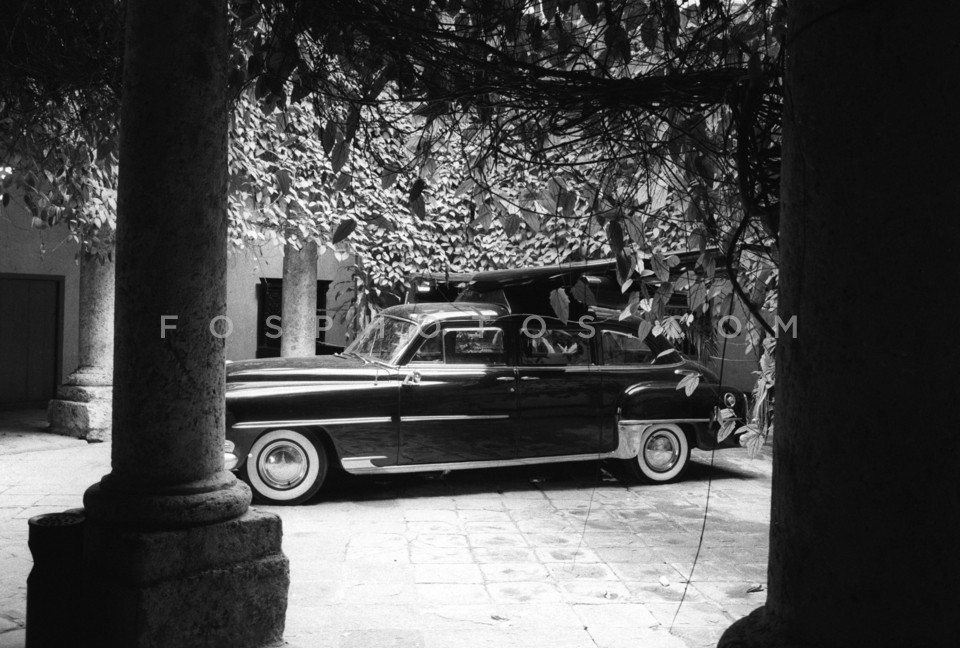 Car from the 50's parked in a courtyard,…