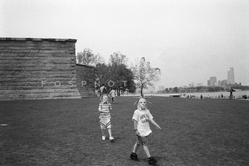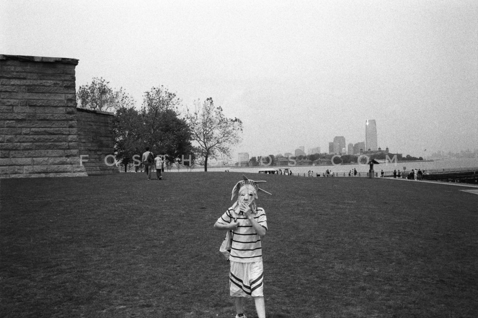 Kid wearing mask of the Statue of Libert…