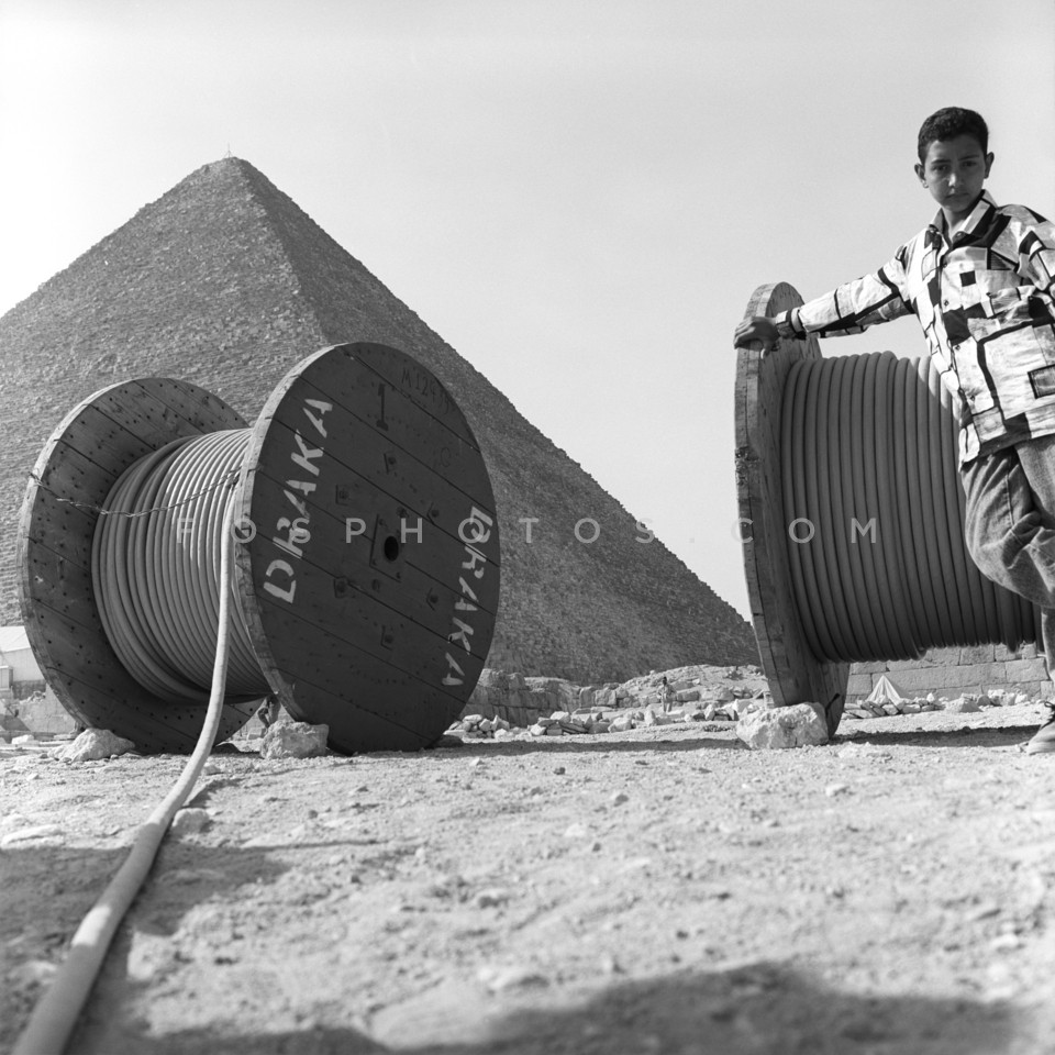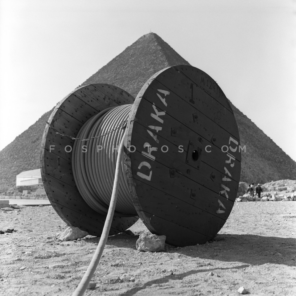 Wire spool in front of pyramid, Egypt, 1995