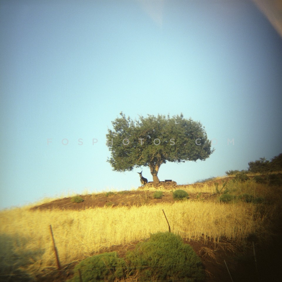 Donkey under a tree in the counrtyside, …